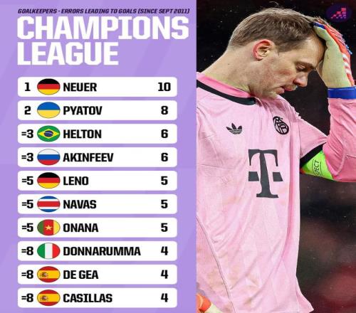 赛后,知名数据机构Opta统计出了自2011年以来欧冠比赛门将失误导致丢球的排行榜,诺伊尔10次排名第一,莱诺、纳瓦斯、奥纳纳、多纳鲁马、德赫亚以及卡西利亚斯上榜。
