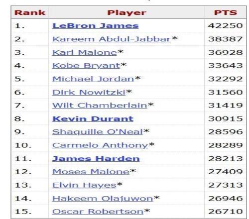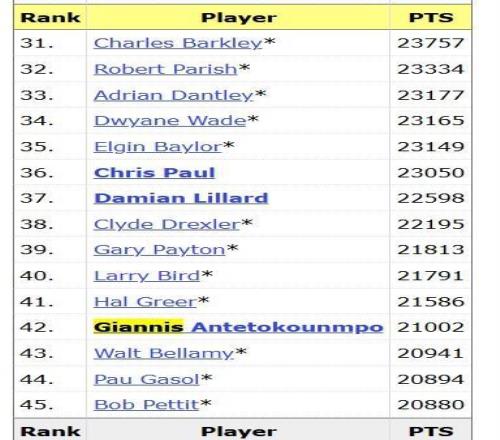 值得一提的是,目前的NBA总得分王是詹姆斯,他得到了42250分;而字母哥目前得到了21002分,仅排名第42位。