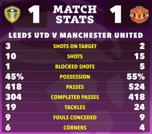 比赛最后时刻,库尼亚的一次远射击中门柱外侧。利兹联也有一两次威胁进攻被曼联门将拉门斯化解,双方最终1-1握手言和。双方各取一分,或许都会感到既满意又不满足。